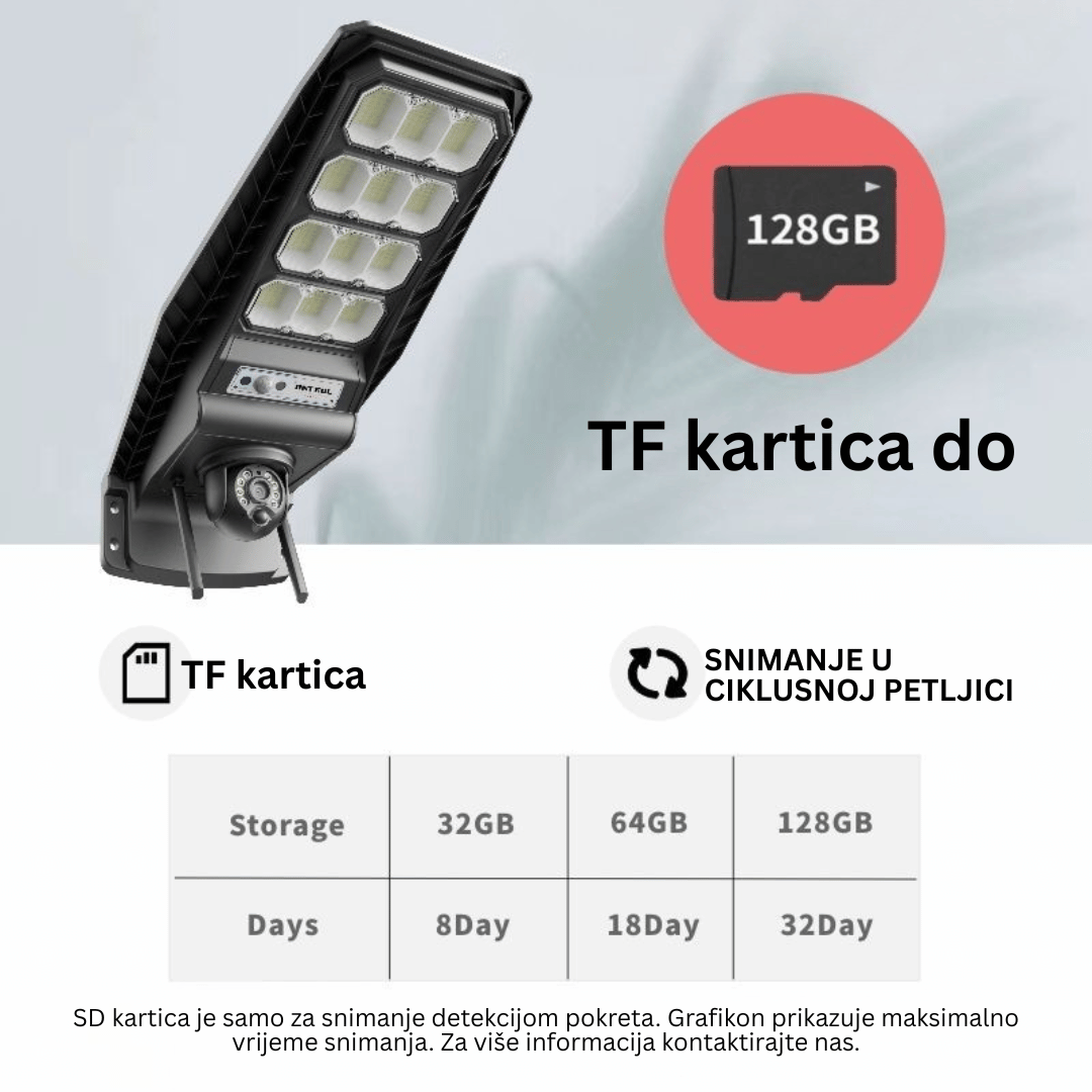 Ova 2-u-1 kamera sa solarnim LED svjetlom ima duži i širi doseg pogleda na zaštićeno područje. U kombinaciji sa solarnim LED svjetlom, prekršaji perimetra uvijek će biti snimljeni do najsitnijih detalja.